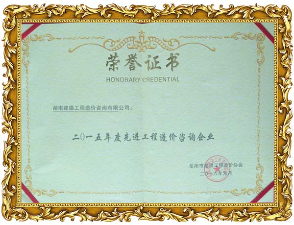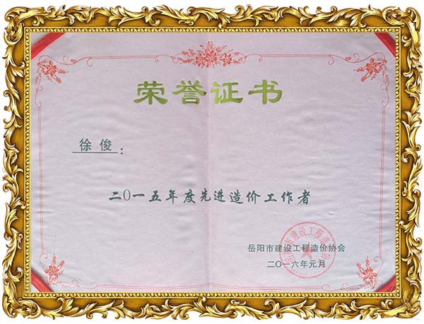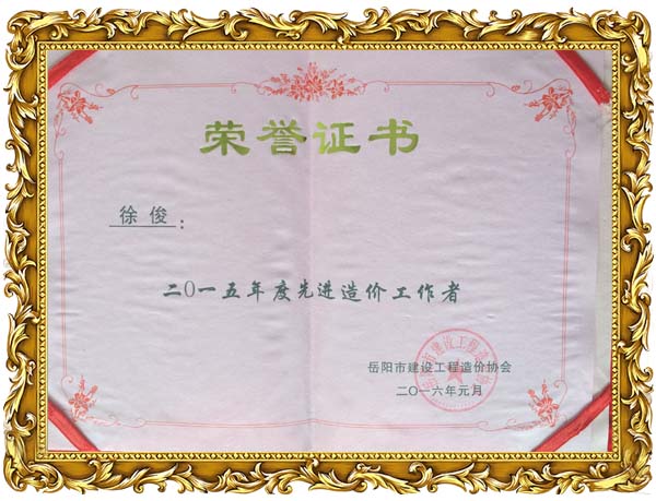 我公司榮獲2015年度岳陽市工程造價協會先進單位榮譽,同時徐俊,倪娟榮獲岳陽市造價協會2015年度優秀個人榮譽。